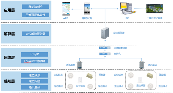 感知層:包括定位標(biāo)簽、定位錨點、激勵器。定位標(biāo)簽和定位錨點之間通過UWB信道實時測距,測距信息通過LoRa 2.4G無線網(wǎng)絡(luò)上傳到通訊基站。